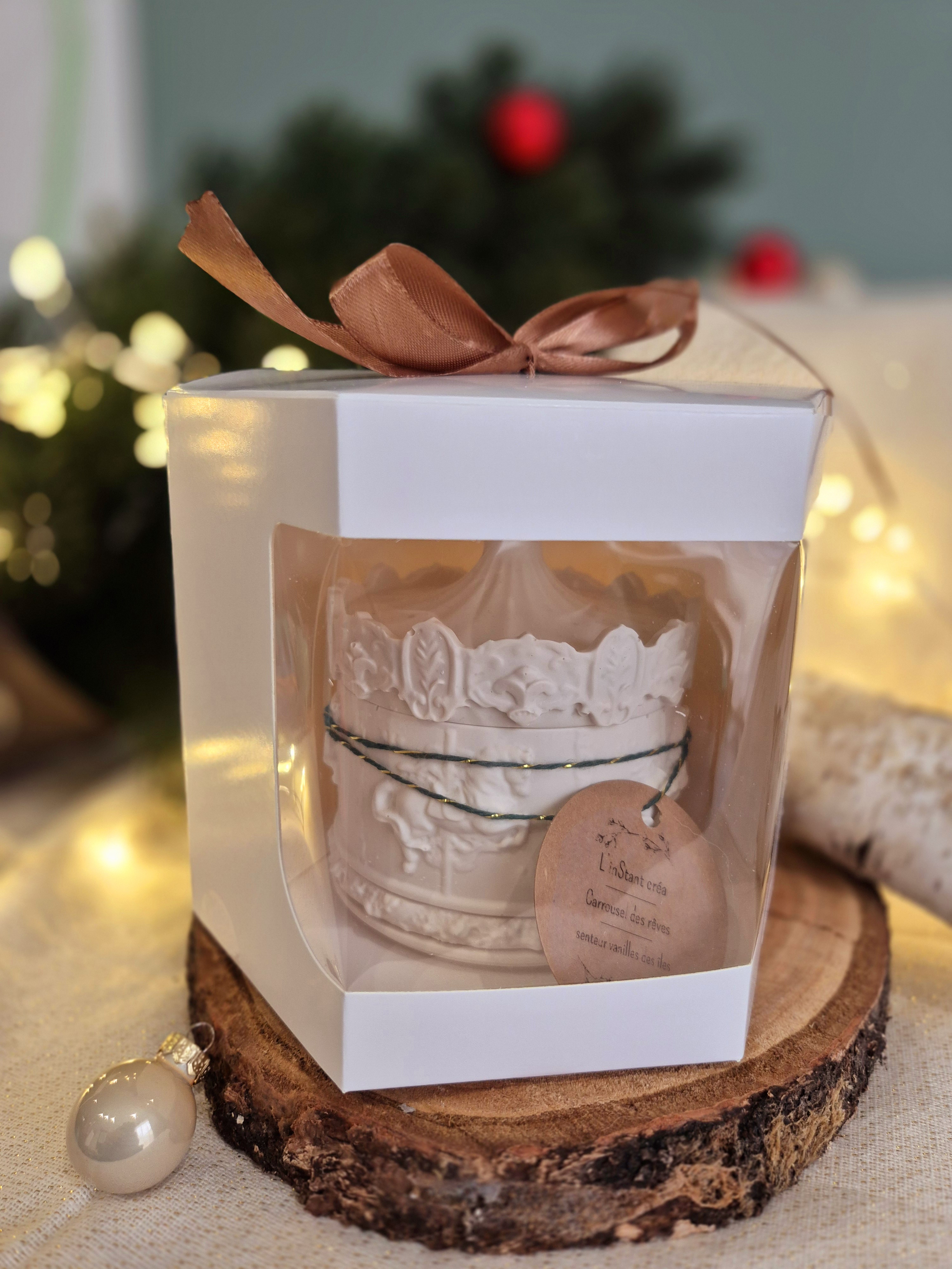 Découvrez notre bougie Carrousel des rêves. Il se compose d'un pot en jesmonite coulé à la main et de 180g de cire végétale. Vous pouvez personnaliser votre contenant en le peignant. Une fois la...