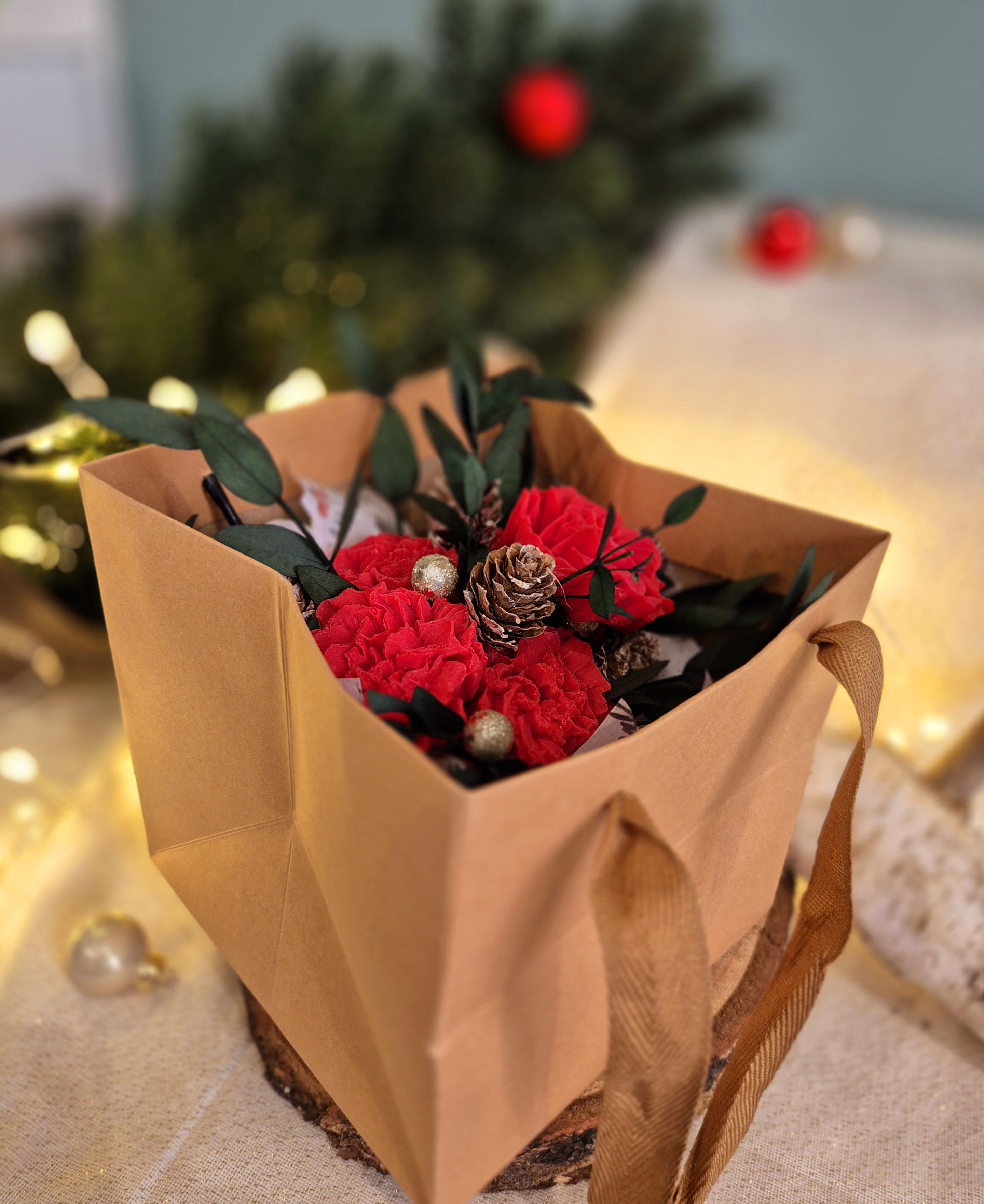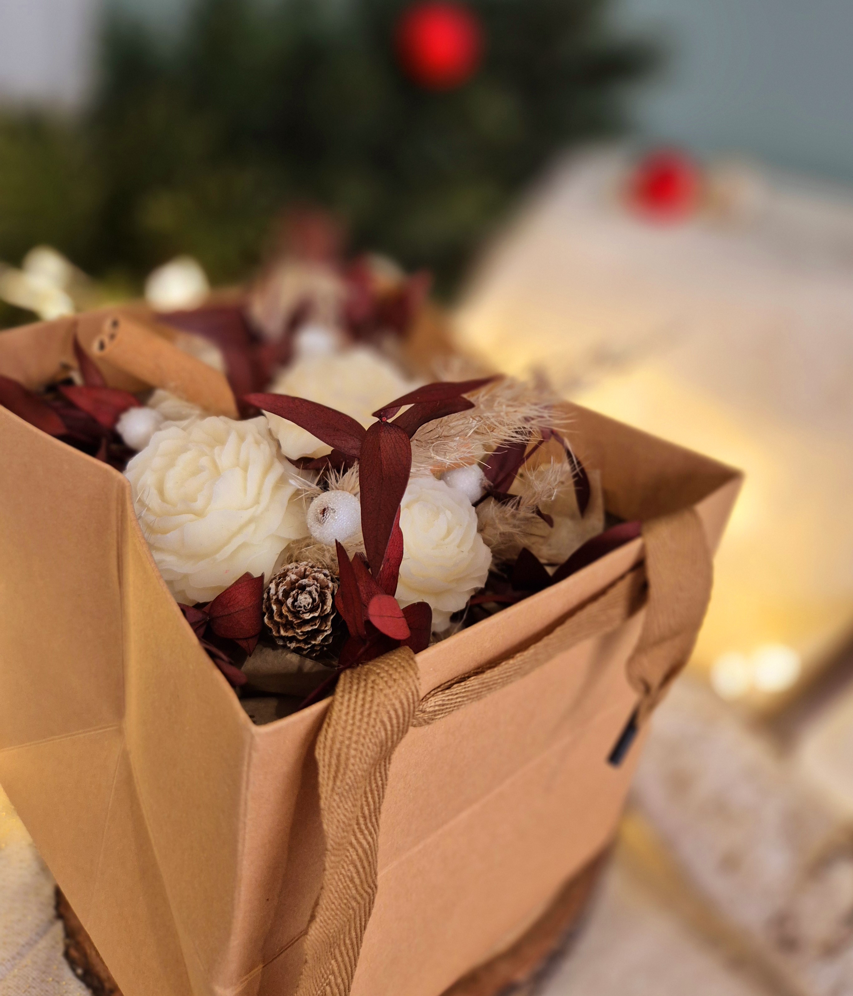 Découvrez notre bouquet l'hiver en rouge. Il se compose de 5 roses blanches parfumées à 13% ce qui font d'elles des fondants. Elles sont composé, au total, de 105g de cire végétale. Les fondants...